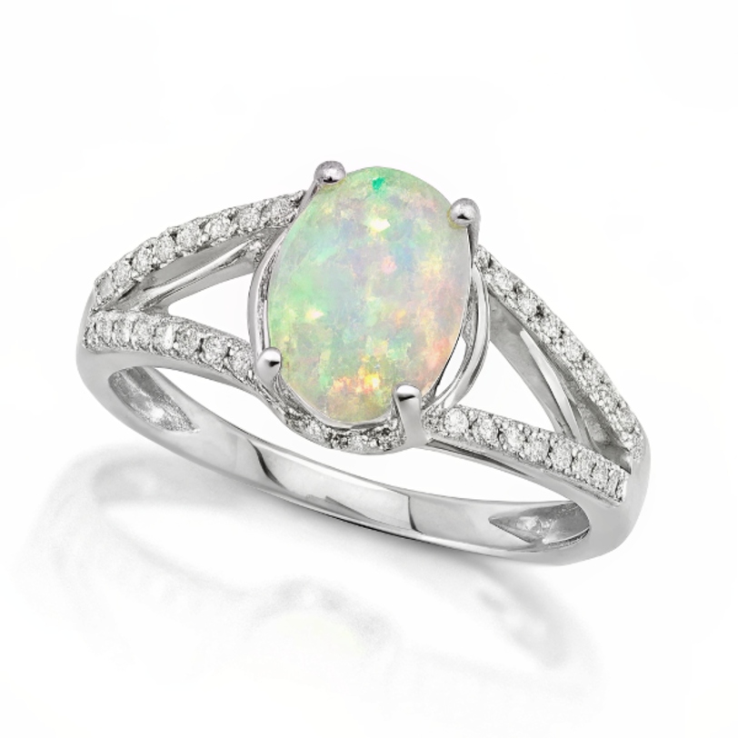 At the heart of this ring lies a mesmerizing oval-cut white opal, radiating an iridescent play of color that dances between soft greens, blush pinks, and golden hues. The opal’s ethereal fire shifts beautifully with every movement, reflecting grace and individuality.